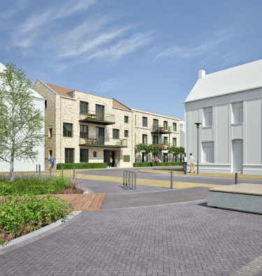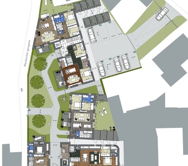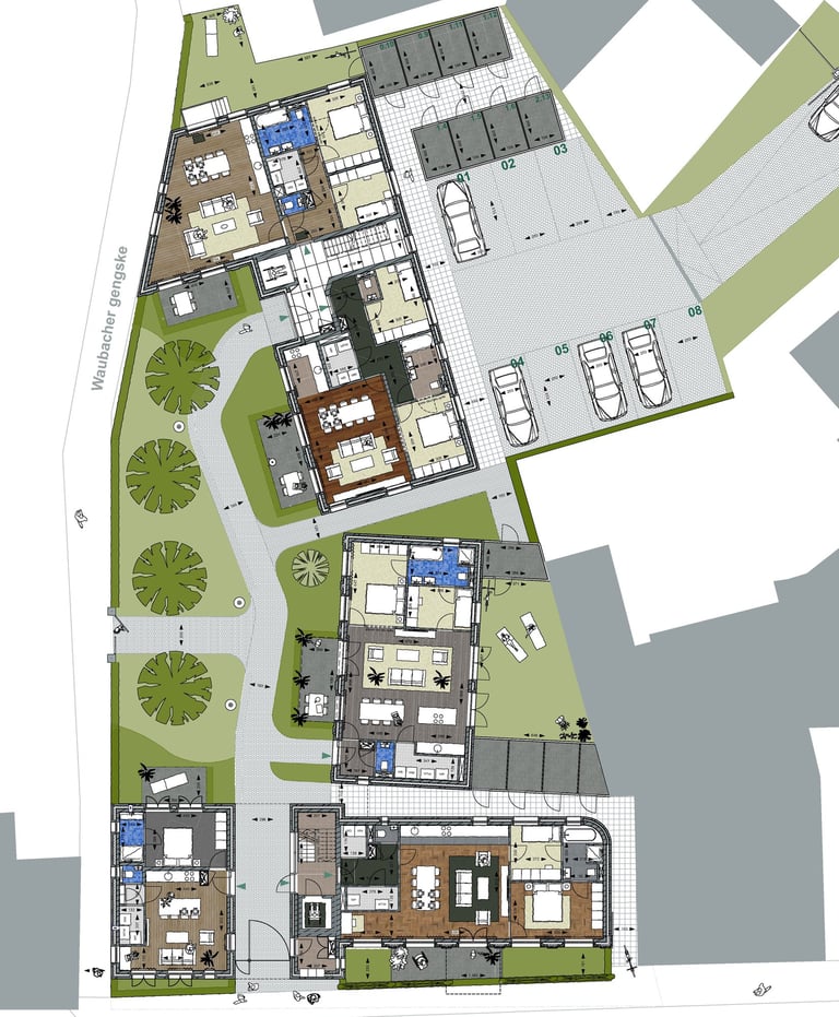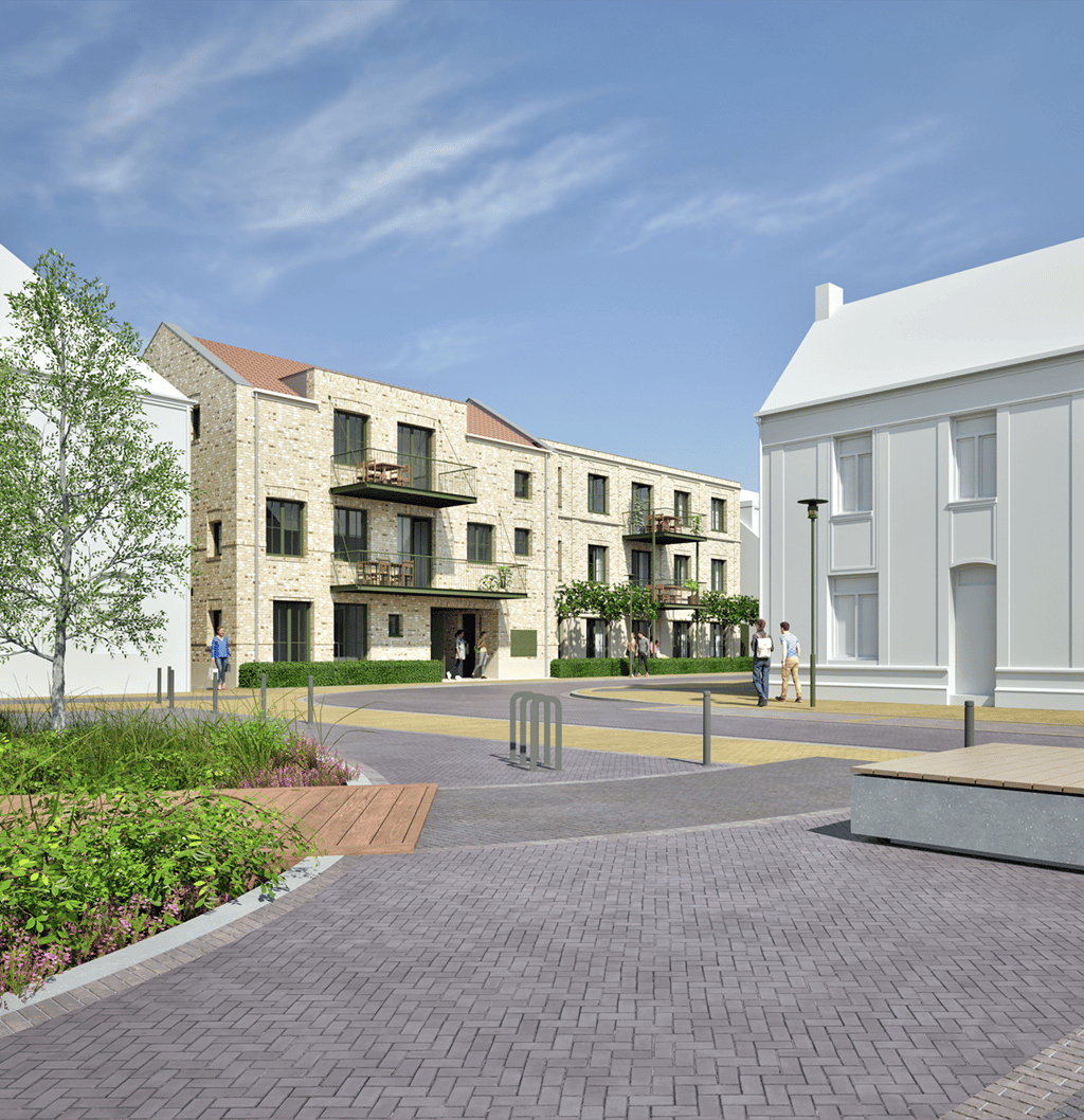 De grote gemeenschapszaal moet daarbij plaats maken voor een binnentuin omsloten door pandjes van een kleinere orde, beter passend op deze plek.