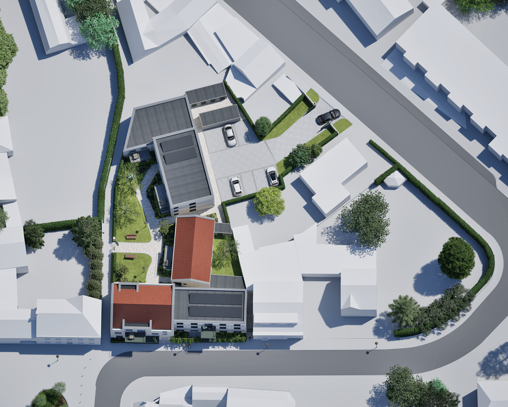 De grote gemeenschapszaal moet daarbij plaats maken voor een binnentuin omsloten door pandjes van een kleinere orde, beter passend op deze plek.