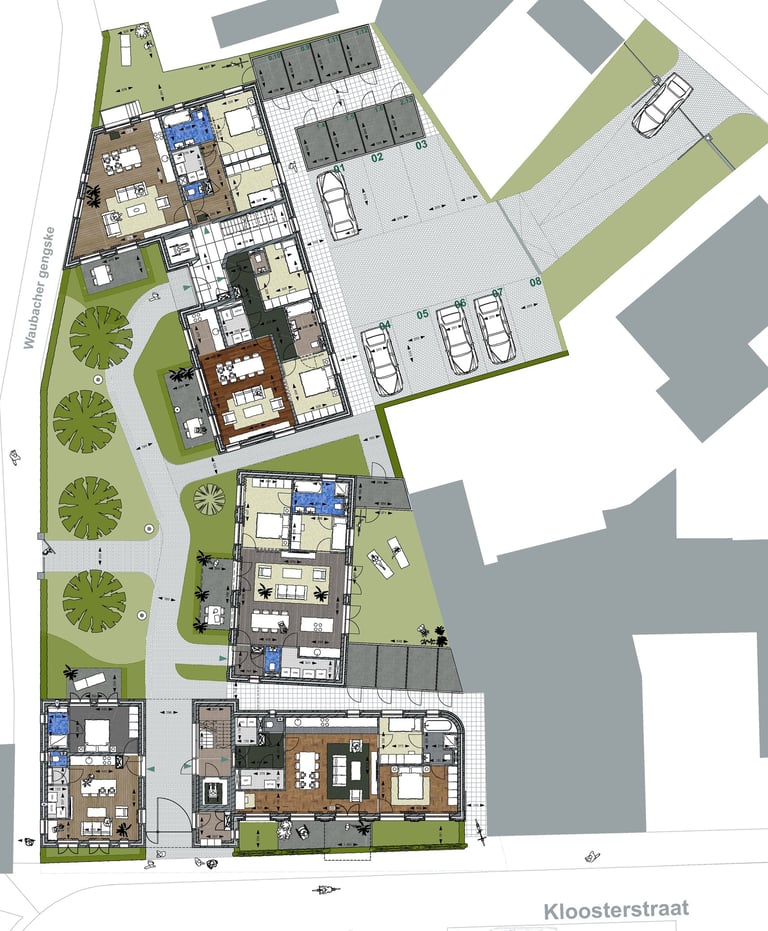 Naast de collectieve binnentuin die zich op het maaiveldniveau van de Kloosterstraat bevindt zijn er ook nog twee woningen die de luxe hebben van een eigen tuin. De collectieve buitenruimte verhoogt het woongenot van de bewoners en deze wordt ingericht in nauw overleg met de toekomstige bewoners.