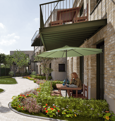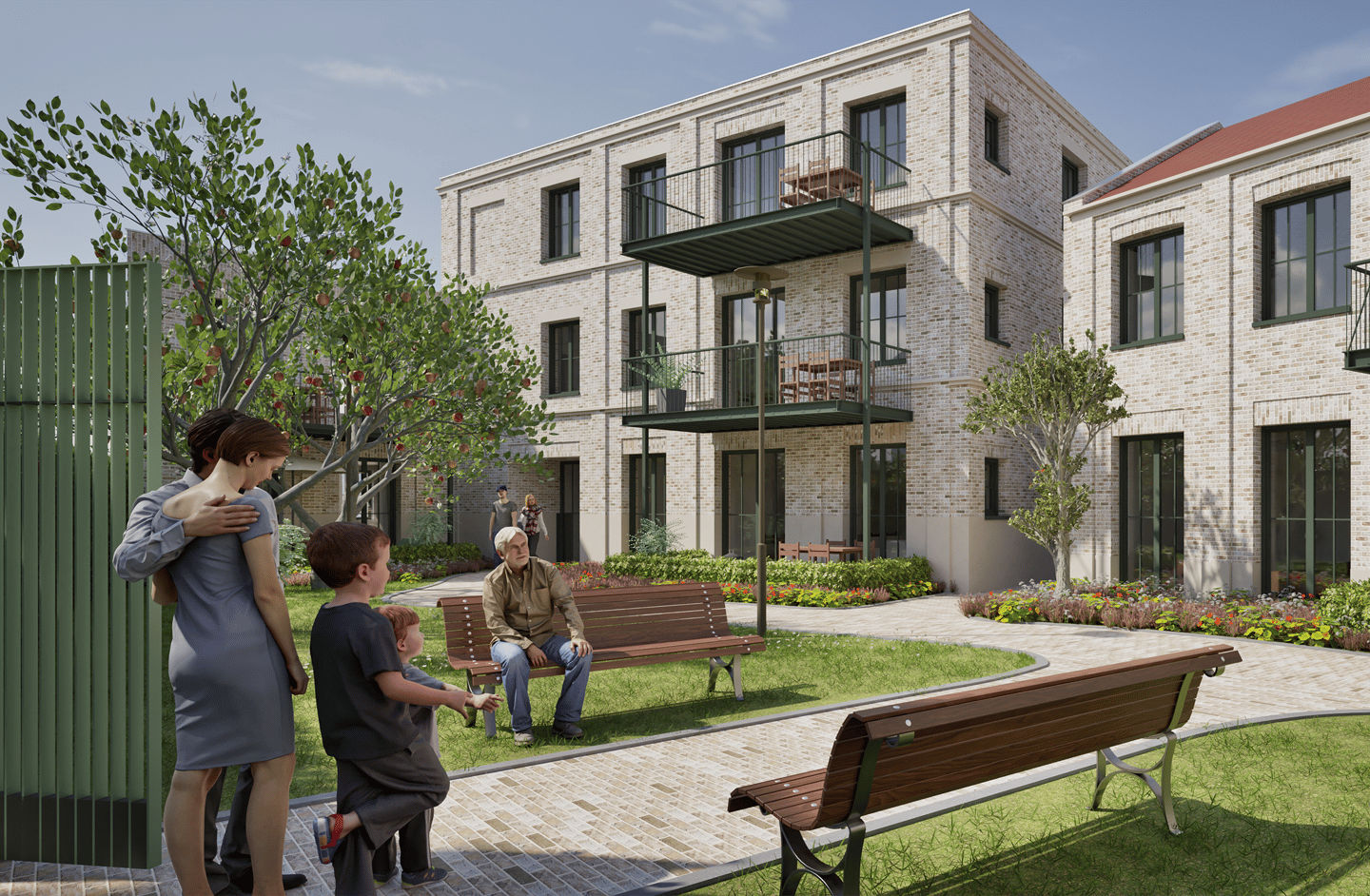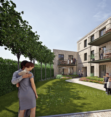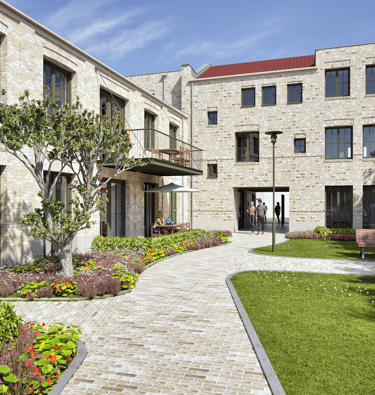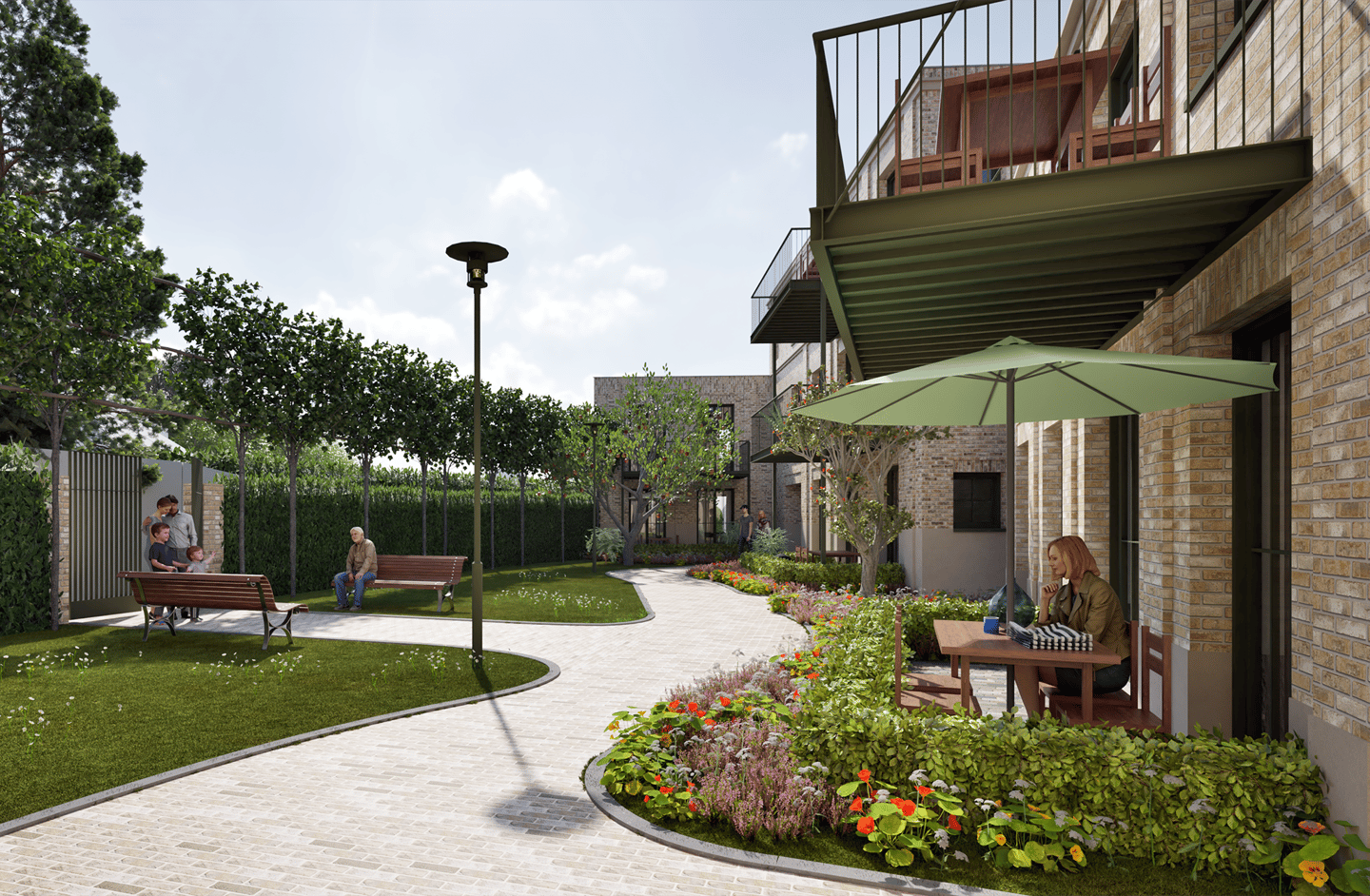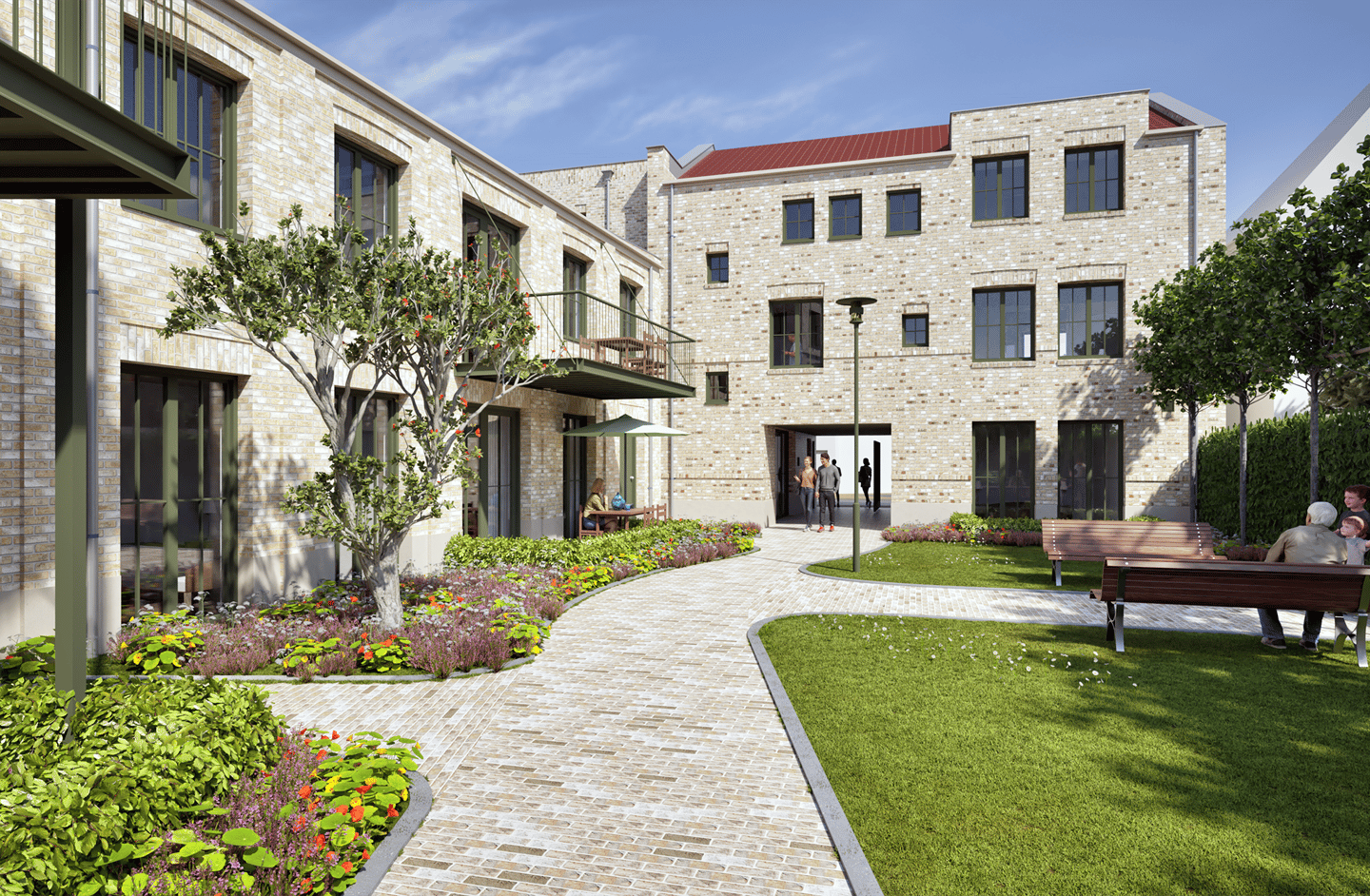 De semi-openbare ruimte is naar de fantasie van de illustrator ingevuld. Er is nog geen definitief ontwerp gemaakt voor de hof. Er kunnen geen rechten worden ontleent met betrekking tot de inrichting van deze semi-openbare ruimte.