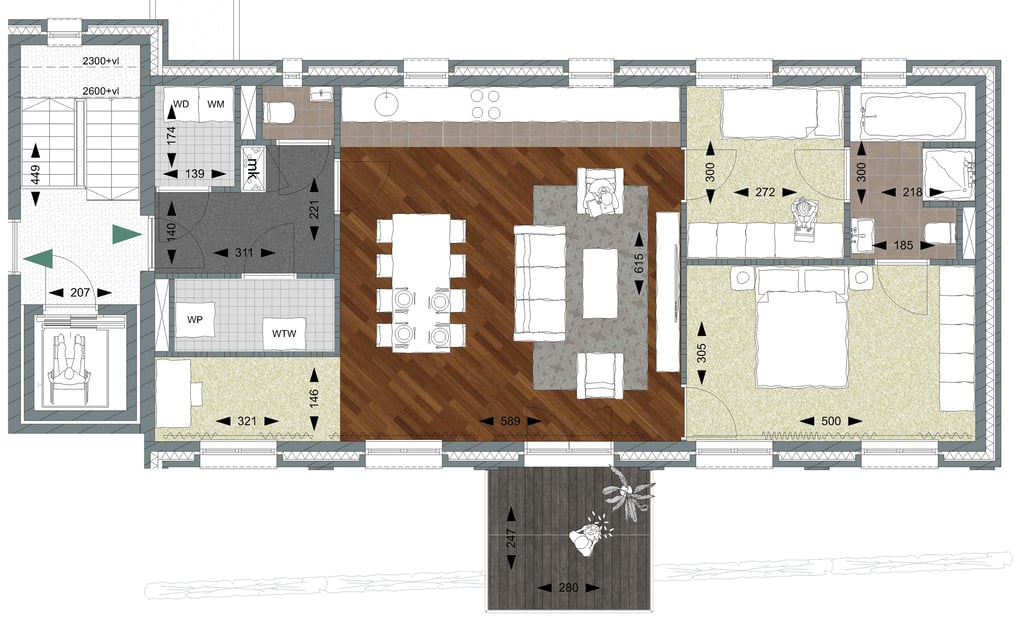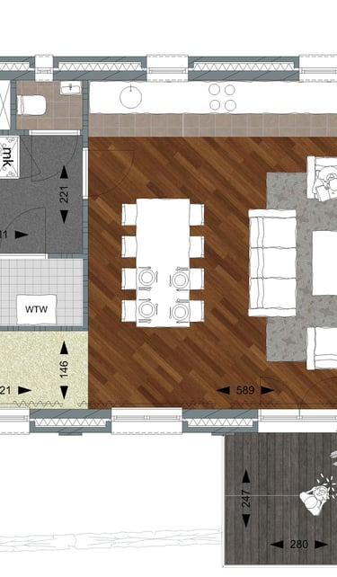 De lichte open-plan leefruimte vormt het hart van het appartement: wonen, eten en een werkhoek lopen vloeiend in elkaar over. Dankzij de grote ramen stroomt het daglicht rijkelijk naar binnen en stap je zo het ruime balkon op met een prachtig uitzicht over de Oude Markt van Waubach – een sfeervolle plek om te genieten van het levendige dorpsleven én van je eigen buitenruimte.