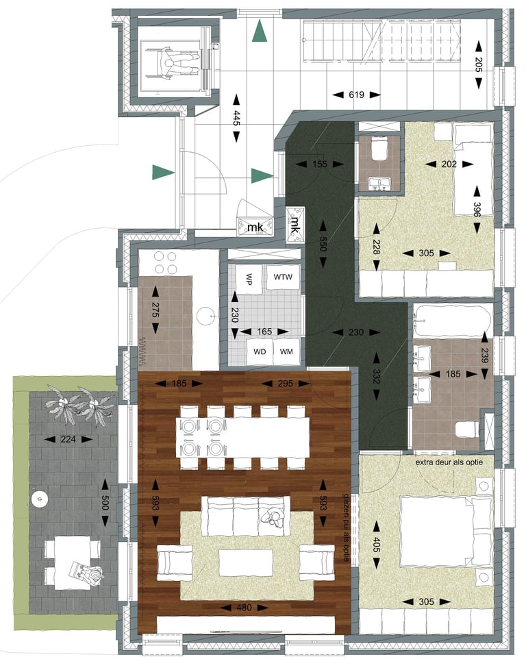 De lichte open-plan leefruimte vormt het hart van het appartement en combineert wonen en eten op een natuurlijke, vloeiende manier. Grote ramen laten het daglicht rijkelijk binnenstromen en bieden toegang tot de fraai aangelegde tuin aan de hofzijde – een perfecte plek om te ontspannen, buiten te zitten en te genieten van groen en rust.