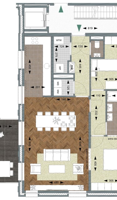 De lichte open-plan leefruimte vormt het hart van de woning en verbindt wonen en eten op een natuurlijke manier. Grote ramen laten het daglicht binnenstromen en geven toegang tot het ruime balkon aan de hofzijde – een heerlijke plek om te ontspannen en te genieten van groen en rust.
